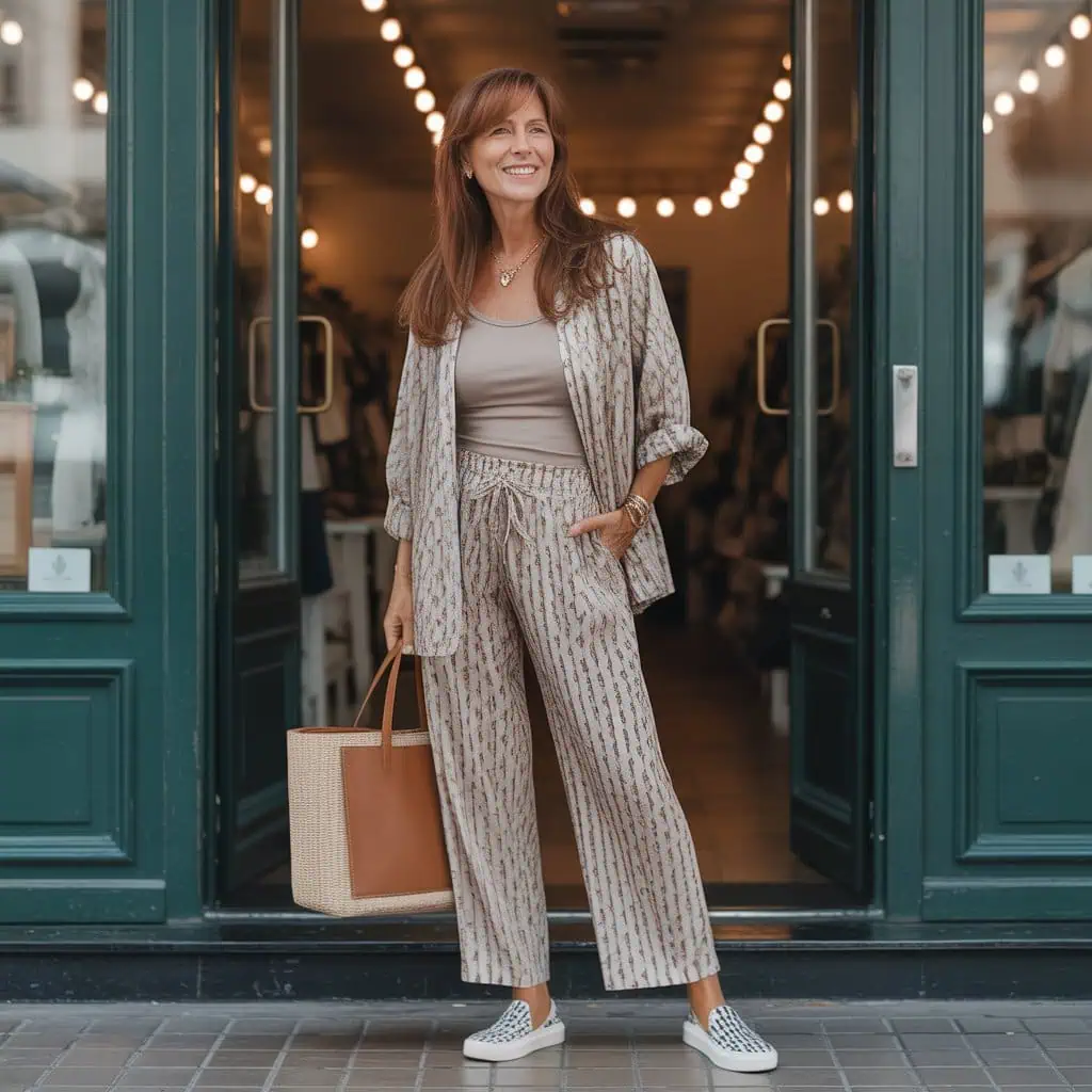 A matchy-matchy two-piece set may seem convenient, but it often feels too coordinated, making the outfit look predictable and lacking in personality. While the matching top and trousers aim for a uniform silhouette, they can end up looking overly rigid and uninspired, offering no visual contrast or intrigue. The attempt at sophistication with printed slip on shoes can feel out of place, disrupting the flow of the outfit and adding unnecessary stiffness. A matching tote and slip-ons, while trying to complete the look, only enhance the monotony, making it appear overly casual and less chic. Accessories like a pop of color or playful sunglasses might attempt to add individuality, but they often feel forced, leaving the overall look lifeless and lacking flair.