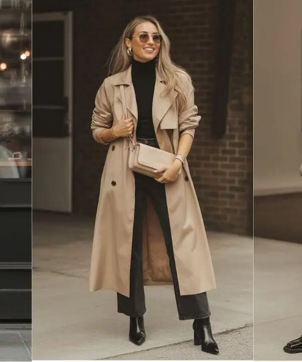 A structured coat is indispensable for elevating any outfit, projecting a sense of sophistication and tailored elegance. The camel trench coat here not only serves as a timeless piece but also creates a rich contrast with the black turtleneck and high-waisted jeans. The belted waist accentuates the figure while maintaining a streamlined silhouette. Chic black ankle boots ground the look, making it versatile for day or night. Accessories like aviator sunglasses and a large leather tote not only serve functional purposes but also reinforce the strong, confident aesthetic, making it a standout choice for urban explorations or casual business meetings.