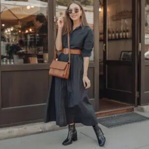 A neutral cashmere sweater is the ultimate wardrobe staple that can effortlessly elevate your look without breaking the bank. Its sumptuous texture exudes sophistication, making it a go-to choice for both casual and more polished outfits. Paired with fitted high-waisted black trousers, the tuck-in style creates a clean silhouette that enhances your shape. The combination of black leather ankle boots with a low block heel adds an element of comfort without sacrificing style. Accessories like oversized sunglasses and minimal gold jewelry bring a modern touch, ensuring you’re chic enough for any occasion, whether it’s brunch or a casual meeting.