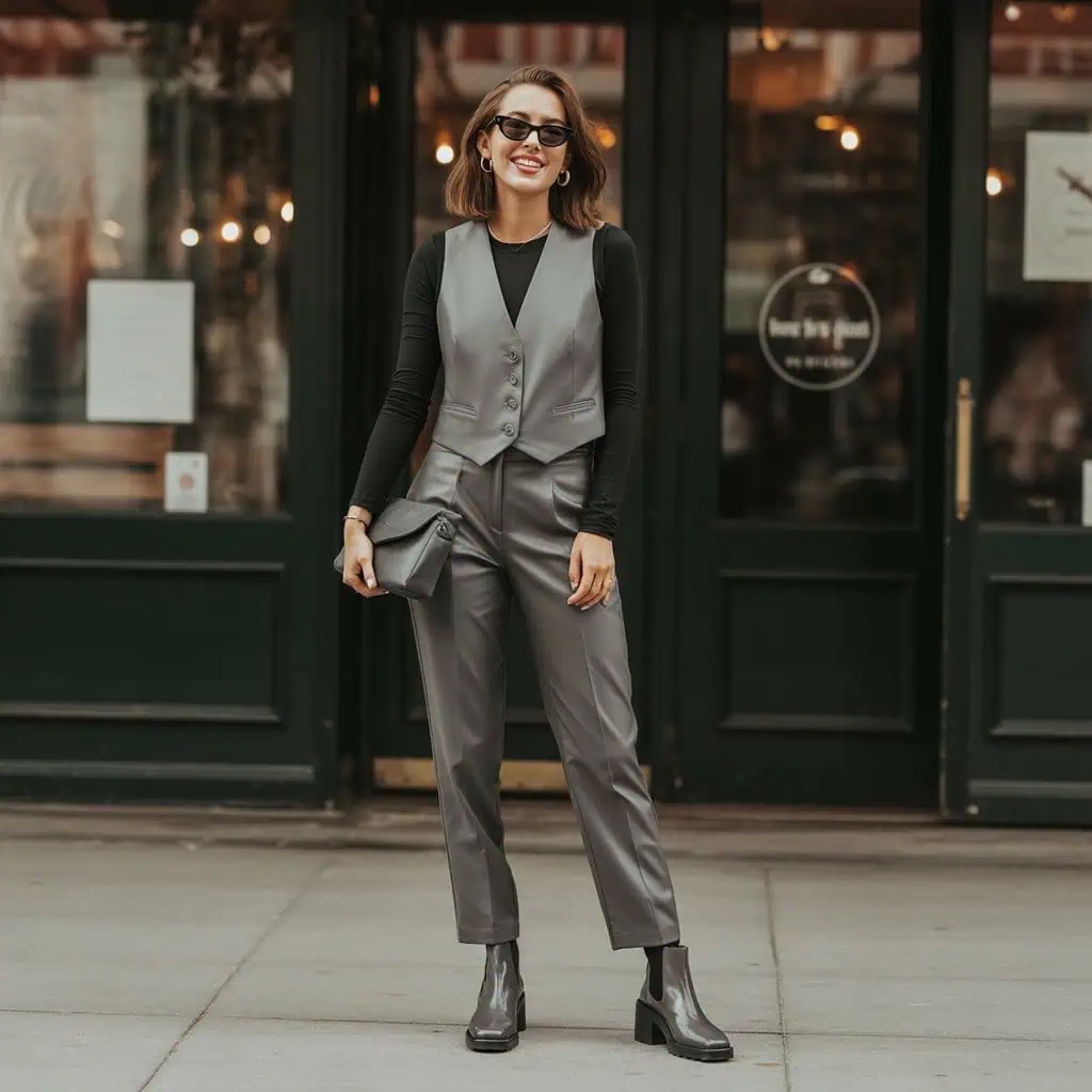Layering is an art, and this outfit exemplifies how to do it with finesse. A fitted black long-sleeve tee provides a sleek base that allows the tailored grey vest to shine, particularly with its clean lines and subtle texture variation. Cropped chinos finish the look, adding a relaxed element that plays well with the structured vest. This combination is ideal for transitional seasons when temperatures fluctuate—just throw on a lightweight jacket if it gets chilly! The charcoal Chelsea boots inject a trendy vibe, while small silver hoop earrings offer understated shine. This outfit is both chic and practical, perfect for navigating your day with style and comfort while making you look effortlessly put-together.