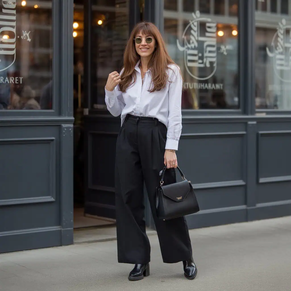 This classic combination thrives on the beauty of simplicity and sophistication. The effortlessly polished look of a white button-down shirt tucked into tailored black trousers creates a streamlined silhouette that works for nearly any occasion, from office meetings to dinner dates. The key to this outfit is the fit; ensuring the button-down isn’t too baggy keeps the overall look crisp. Pairing this ensemble with sleek black ankle boots adds a touch of modern flair, while minimal accessories, like stud earrings and round sunglasses, give it just the right amount of chic. This is one of those outfits where you feel put together without feeling like you’ve tried too hard—perfect for those busy days when your mind is on a million different things!