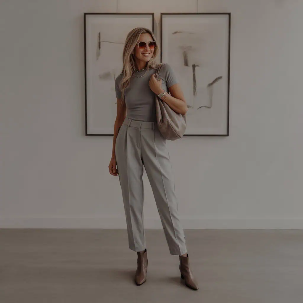 Staying in the same color family is a brilliant way to create a sophisticated and polished look with minimal effort. By opting for monochrome basics, like a t-shirt with tailored trousers, you not only elongate your figure but also create a soft, harmonious palette that’s easy on the eyes. Neutral tones keep things effortlessly chic, while the varying textures—from the softness of the shirt to the drape of the trousers—add depth. This outfit is perfect for casual outings or meetings, as it looks great without feeling too fussy. Pair it with sleek ankle boots and understated jewelry, and you’ll exude confidence while remaining comfortable all day long.
