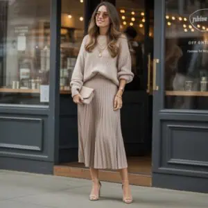 Combining a cozy sweater with a pleated midi skirt strikes the perfect balance between laid-back and put-together. The navy sweater, tucked in at the waist, creates a flattering silhouette that enhances your figure while keeping things casual. Opting for a beige pleated skirt adds texture and movement, giving your outfit an air of sophistication. Accessorizing with round sunglasses and pearl earrings maintains a chic vibe without being overly fussy. The black ankle-strap heels bring an element of polish, ensuring you’re ready for brunch or an afternoon outing while feeling comfortable and stylish.