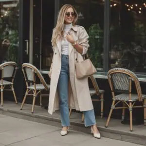 A coatigan layered over fitted knit pants gives off a polished yet cozy vibe that’s perfect for winter outings. The long coatigan provides structure and warmth, while its gentle drape adds a touch of sophistication. Pairing it with a fitted dark teal turtleneck creates a stunning contrast, showcasing that rich color against the neutral tones of the coatigan. White knit pants not only enhance comfort but also bring a fresh, modern twist to the classic look. With the addition of nude kitten heels and tasteful accessories, this ensemble ensures you’re chic and comfortable, making it a go-to outfit for social lunches or casual gatherings.