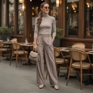 The cardigan is a staple that transcends seasons; its layered style offers both warmth and versatility. A cozy camel cardigan can effortlessly dress up a light gray turtleneck while maintaining comfort. This outfit choice strikes a perfect balance between trendy and classic, making it ideal for a variety of situations. Paired with straight-leg dark denim jeans, it creates a chic silhouette that flatters every body type. When accessorized with a matching handbag and minimal jewelry, the whole look becomes effortlessly sophisticated. A cardigan can easily be thrown on over your outfit for a polished finish, proving essential for those who want to blend style with practicality.