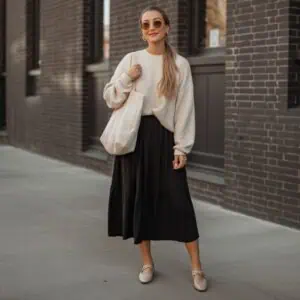 The midi skirt has become an iconic piece for its ability to blend femininity with versatility. When styled with a fitted white turtleneck, it creates a refined balance that accentuates the waist and adds a touch of elegance. The flowing black A-line skirt adds dynamism to the outfit, making it suitable for everything from gallery openings to weekend brunches. Complementing this with beige heels elongates the silhouette, while a structured nude handbag provides practicality without sacrificing style. Accessories like brown-tinted sunglasses and delicate gold jewelry bring a subtle, chic flair that ties the entire ensemble together, ensuring you look effortlessly stylish no matter the occasion.