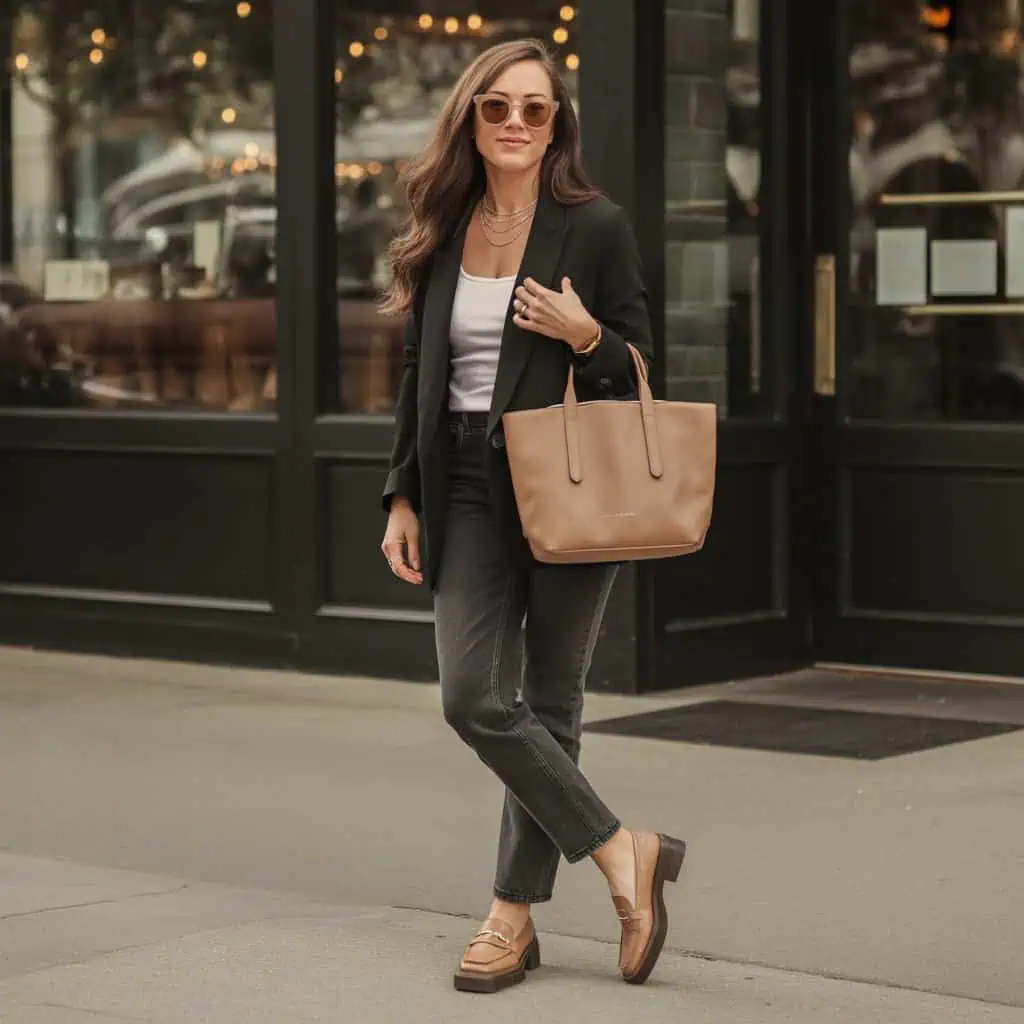 Achieving a chic black-on-black look while incorporating warm accents is easily accomplished with sleek leather loafers. This ensemble combines a fitted black turtleneck with high-waisted wide-leg trousers, creating a streamlined silhouette that flatters any body type. The high waist elongates the legs, while the turtleneck creates an air of sophistication. Tan loafers provide a warm contrast, breaking the monochrome scheme while adding a touch of uniqueness to the outfit. A brown handbag complements the tan accents beautifully, seamlessly merging style with functionality. Cat-eye sunglasses bring a trendy vibe, while minimalist gold jewelry ensures a striking yet delicate finish. This effortless look is not only stylish but also practical, making it ideal for those busy days when you still want to feel put together.