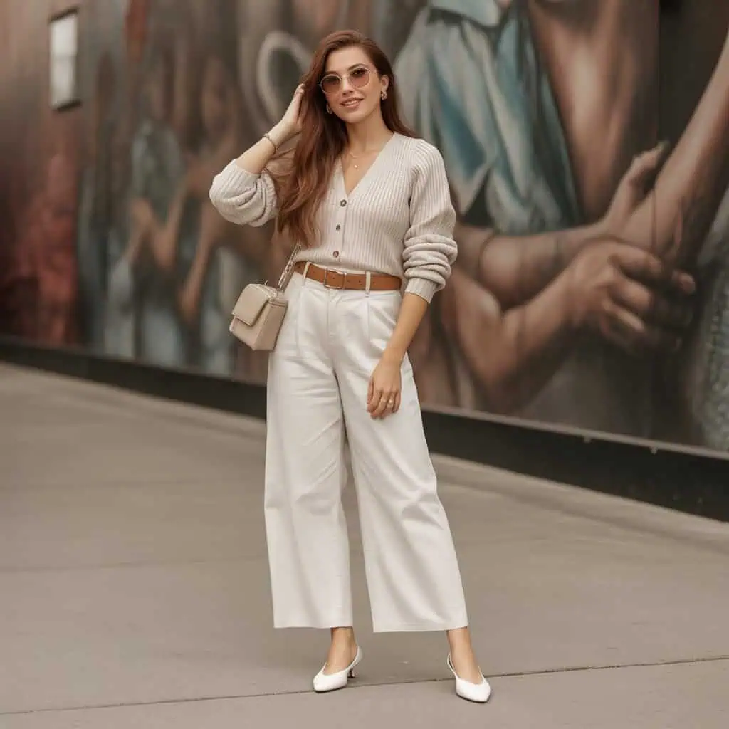 Pairing a cozy knit sweater with wide-leg pants creates a laid-back yet sophisticated vibe that’s hard to beat. The warm texture of a knit adds a layer of comfort, while the cream wide-leg pants provide a flowing silhouette that feels chic and effortless. Burgundy suede pointed-toe pumps introduce a rich shade and height, balancing the loose fit of the outfit smartly. A taupe shoulder bag adds a hint of elegance, and pearl earrings bring a touch of classic polish. With brown square sunglasses for an unexpected twist, this ensemble is perfect for those days when you want to look stylish without trying too hard.
