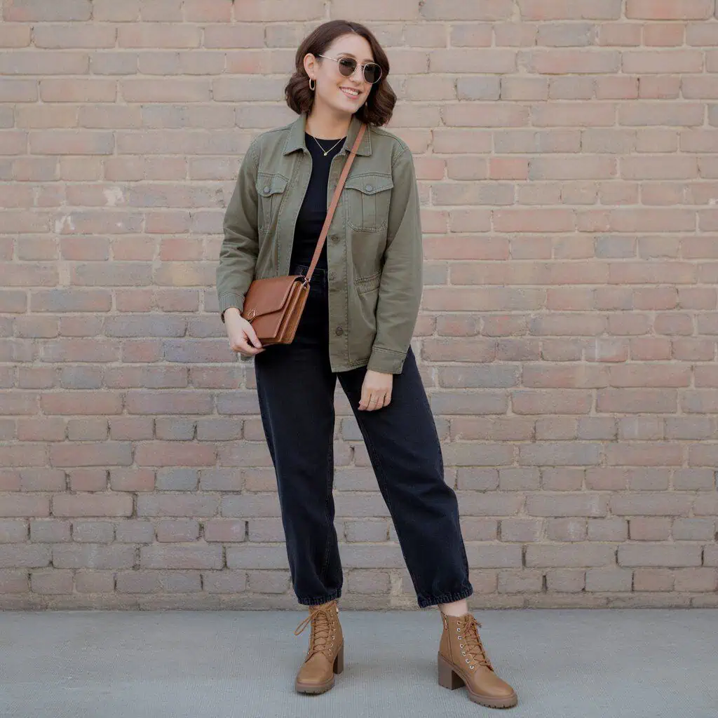 The utility jacket brings an effortlessly cool edge to a classic pair of black jeans, making it a versatile layering piece for any wardrobe. The olive color of the jacket offers a rich contrast against the dark wash jeans, adding depth to your outfit. Tossing it over a black knit top creates a chic monochromatic base that allows the utility jacket to really make a statement. Tan lace-up ankle boots add a rugged touch while maintaining comfort, making them perfect for all-day wear. Small hoop earrings and aviator sunglasses enhance the vibe without distracting from the overall look. This outfit is not just stylish; it’s practical, proving that you can look fabulous while staying comfortable and functional.