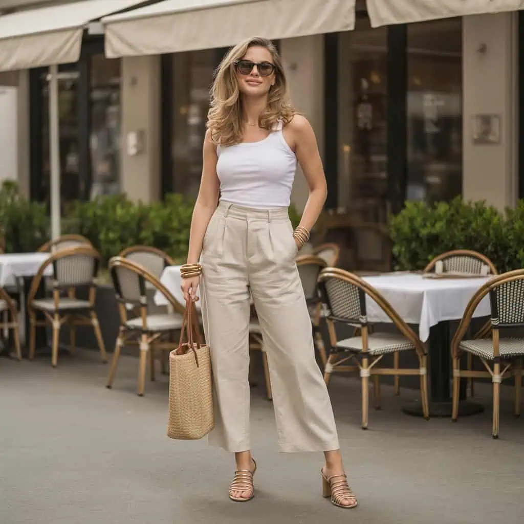 There’s something effortlessly chic about pairing a fitted tank with wide-leg linen trousers. This combination speaks to the beauty of balance—while the tank hugs the body and accentuates your silhouette, the flowy trousers create a relaxed yet polished vibe. The lightness of linen contributes to a breathable outfit, perfect for warm days, and the wide legs elongate the frame, making it universally flattering. Accessorizing with strappy camel heeled sandals elevates the look without overpowering it, while a woven tote adds a casual sophistication. To complete your ensemble, dark oversized sunglasses provide that touch of glam, ensuring you’re ready for any sun-kissed occasion.