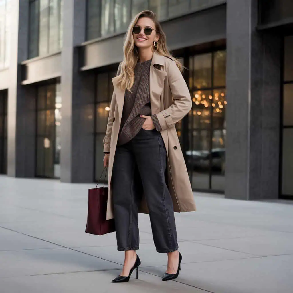 A trench coat brings an air of sophistication that instantly elevates any outfit, especially when layered over well-fitted basics like a charcoal sweater and dark denim jeans. This combination marries elegance with casual attire, making it a versatile choice for anything from brunch to office meetings. The sharp lines of the trench coat create a striking silhouette, while pointed-toe stiletto heels inject just the right amount of chicness. A burgundy tote not only adds a splash of color but also serves to tie the entire look together. With accessories like thin gold hoops and aviators, this outfit showcases the perfect mix of classic style and modern flair.