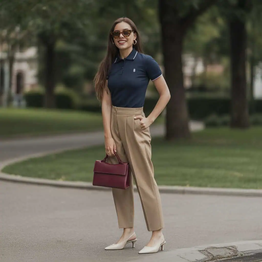 A classic navy polo shirt paired with tailored khakis epitomizes refined casual style. This combo is not only incredibly versatile, but it also strikes the right balance between comfort and elegance. The polo shirt offers a sleek look that can easily transition from day to evening. Tailored khakis, particularly in a lightweight fabric, provide a modern silhouette and a polished feel without sacrificing comfort. Cream slingback kitten heels add a dash of femininity, ensuring you’re both stylish and comfy. Accessorizing with a structured burgundy handbag and thin gold hoops brings a touch of sophistication, while the tortoiseshell sunglasses finish off the outfit with a retro flair, making it perfect for any laid-back yet chic outing.