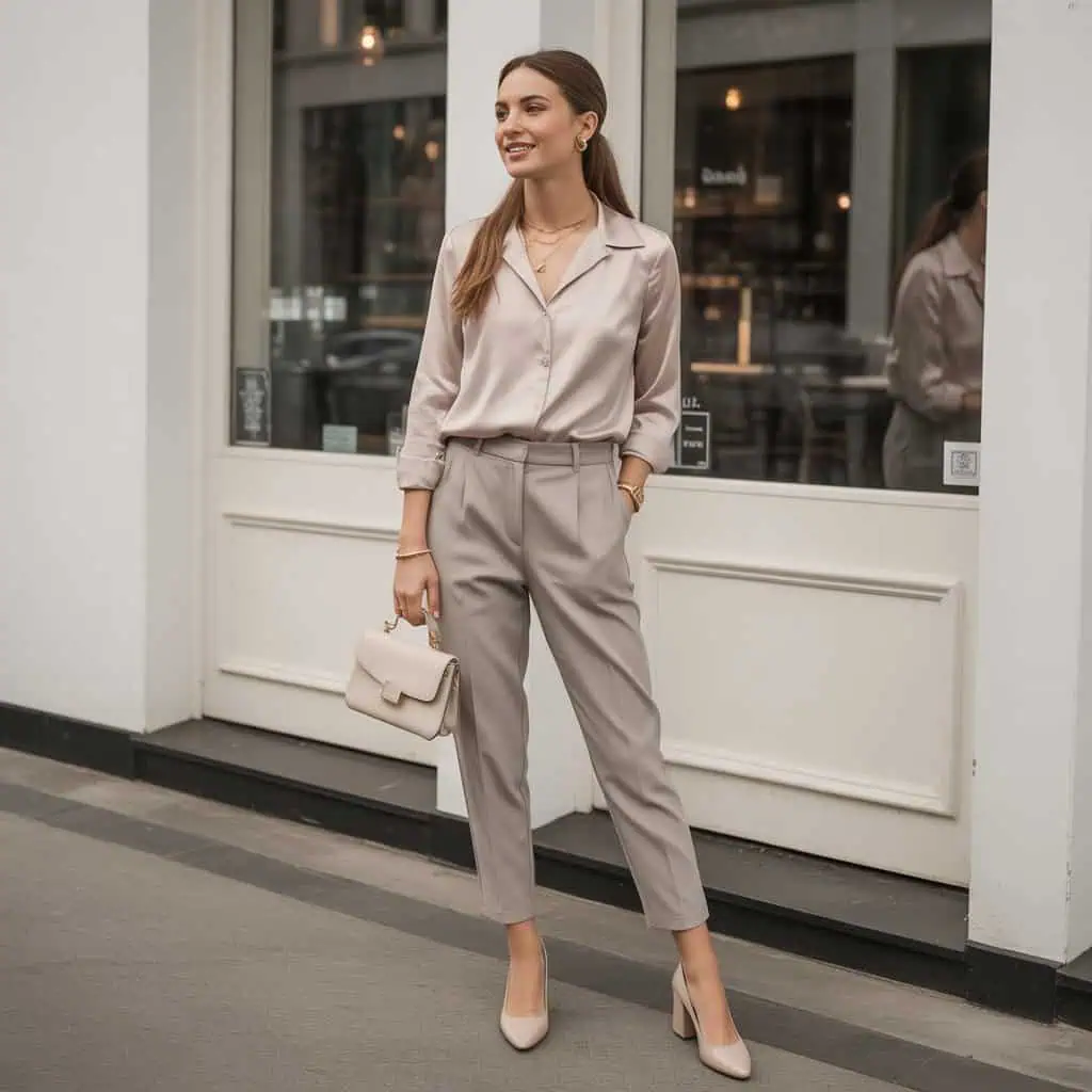 A silk blouse tucked into tailored ankle pants is an elegant blend of professionalism and femininity. The soft blush tone of the blouse exudes warmth and approachability, making it perfect for both office settings and lunch dates. Tailored ankle pants add structure and polish, creating a sleek and elongated look that flatters a variety of body shapes. Nude block-heel pumps seamlessly lengthen the leg line, ensuring you stride with confidence. Accessorizing with layered necklaces and gold studs introduces a touch of glamour without overwhelming the outfit, allowing the luxurious fabric of the blouse to shine. This ensemble strikes just the right balance between chic and sophisticated.