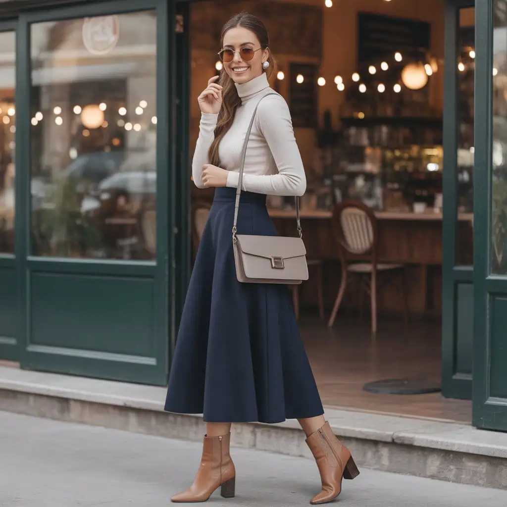 Combining a fitted turtleneck with a flowing midi skirt creates a beautiful balance between structure and fluidity. The turtleneck offers a sleek foundation that elegantly shapes your silhouette, while the cinched waist of the skirt adds definition and femininity. The choice of a solid navy skirt allows for versatility, allowing you to play with different colors in your accessories. Camel ankle boots with a block heel provide comfort yet keep your look refined. A structured crossbody bag acts as the perfect functional element, while pearl studs add a touch of classic elegance. This outfit is ideal for the office or a cozy café date, enveloping you in effortless sophistication.