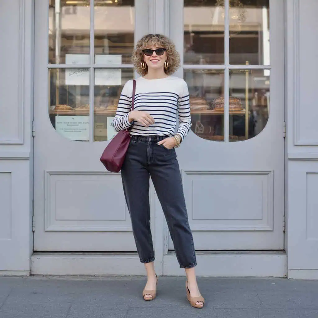 Breton stripes are a fashion staple that exudes effortless chic. When paired with dark denim, this classic top instantly revitalizes casual outfits. The navy-and-white stripes offer a timeless nautical vibe, while relaxed-fit jeans keep the look grounded and approachable. Wedge heels elevate your stance, adding a hint of sophistication without too much effort. Accessorizing with a burgundy shoulder bag brings a pop of color, adding interest to the outfit. Small gold hoops and cat-eye sunglasses not only add a touch of whimsy but also polish off the overall ensemble, making it perfect for brunch outings or weekend strolls.