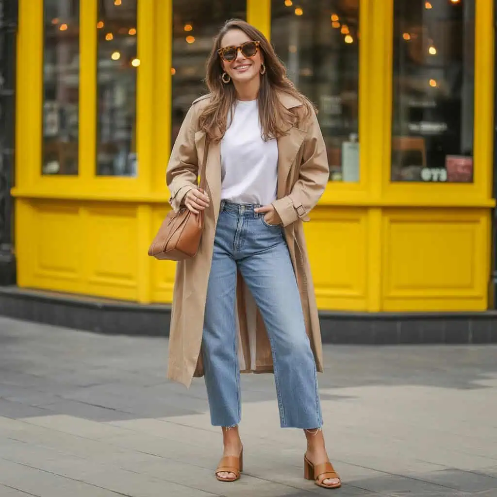 A classic white tee and straight jeans provide the ideal canvas for effortless chic. The versatility of a crisp tee allows for easy layering while maintaining comfort and style. By opting for straight-leg jeans, you create a balanced silhouette that elongates the legs and adds structure. The tan block-heel sandals elevate the outfit while ensuring all-day wearability, making them perfect for transitioning from day to night. Toss on a light camel trench coat for a touch of sophistication and warmth, and don’t overlook the accessories; a crossbody bag, gold hoops, and tortoiseshell shades effortlessly add personality while keeping the look modern and polished.