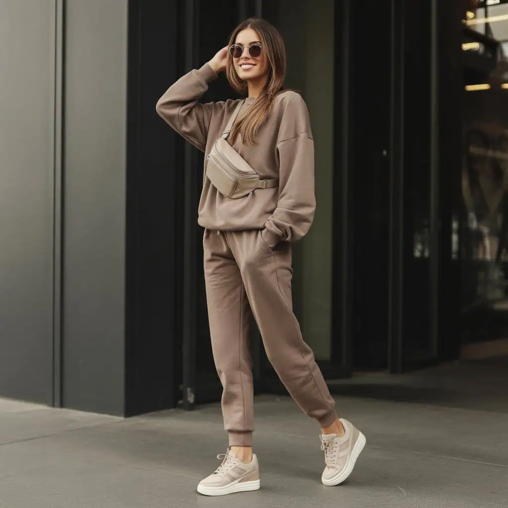 Elevate your casual ensemble with the dynamic duo of a crewneck sweatshirt and joggers—a combination that marries comfort with style effortlessly. This outfit radiates a sporty-chic vibe, making it an ideal choice for running errands or catch-ups with friends. The soft lavender hue of the sweatshirt adds a refreshing twist, while the tapered joggers ensure a streamlined silhouette. Pairing this look with wedge sneakers not only adds height but also a touch of sophistication, perfect for those who want to feel both casual and put-together. Finish the look off with a crossbody bag for hands-free convenience, and you’re ready to conquer the day in style.