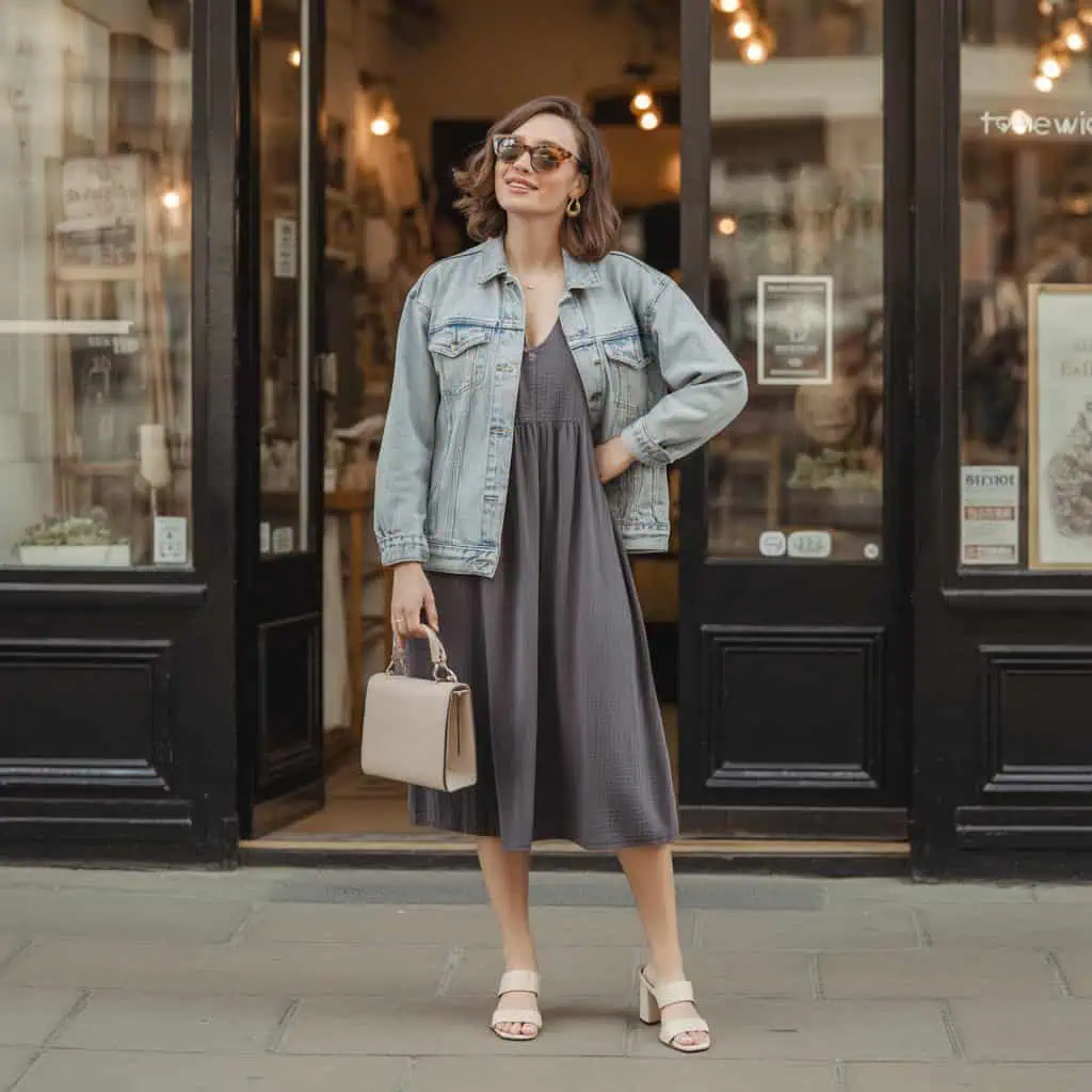 A denim jacket paired with a cotton dress effortlessly channels that coveted ‘cool girl’ vibe. While the dress brings femininity and ease, the jacket adds a layer of casual chicness, making it suitable for both daytime and evening outings. The contrast between the soft charcoal of the midi dress and the light-wash denim creates visual interest, while cream heeled sandals subtly broaden the palette. Structured handbags and gold earrings introduce polished elements, ensuring the look remains balanced. Tortoiseshell sunglasses add a hint of retro appeal, elegantly rounding off this versatile outfit that embodies relaxed elegance with a hint of personality.