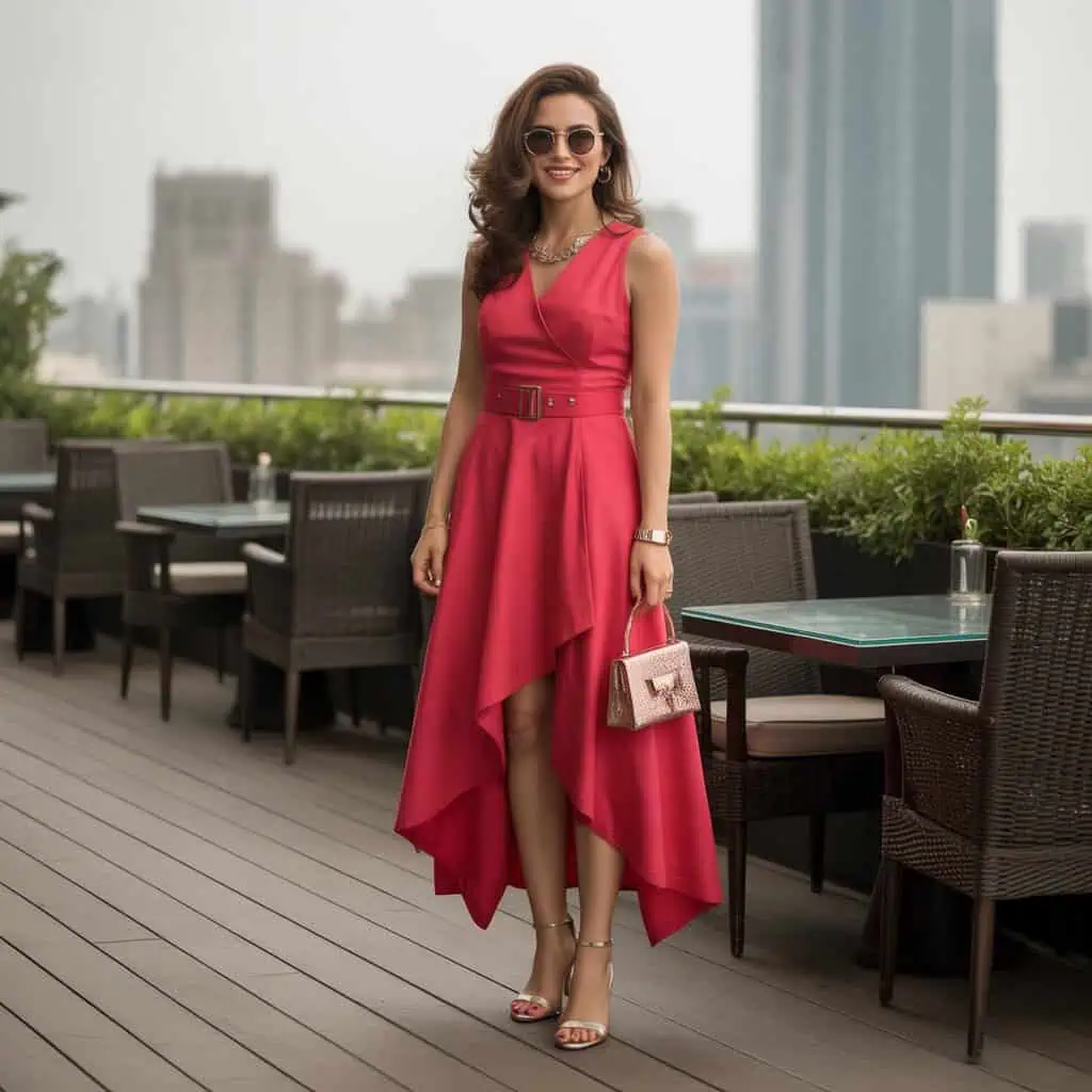 Making a statement at a cocktail party becomes effortless with an asymmetrical hem dress. This unique cut draws the eye and adds a dynamic touch to your outfit, perfect for showcasing your fashion-forward sense. Opting for a striking color like red ensures you stand out in any crowd, and the waist belt enhances your silhouette by creating definition. Pairing it with trendy heeled sandals not only elongates the legs but also adds a hint of modern elegance. Completing the look with stylish sunglasses and statement jewelry allows for a touch of individuality, making you the epitome of chic sophistication as you mingle and celebrate the night away.