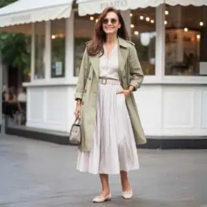 The timeless trench coat transcends generations, and when paired with dark denim, it creates an effortlessly sophisticated look. A classic sand-colored trench not only adds a touch of elegance but also provides warmth—perfect for crisp fall days. Tucking an olive green blouse into belted dark wash jeans enhances the silhouette, making it both flattering and stylish. The rich hues contrast beautifully, bringing a depth to the outfit. Slip on tan loafers for a comfortable yet chic finish, then let your accessories shine, like gold bangles and oversized sunglasses. This ensemble promises versatility, whether you’re meeting friends or savouring a leisurely day out.