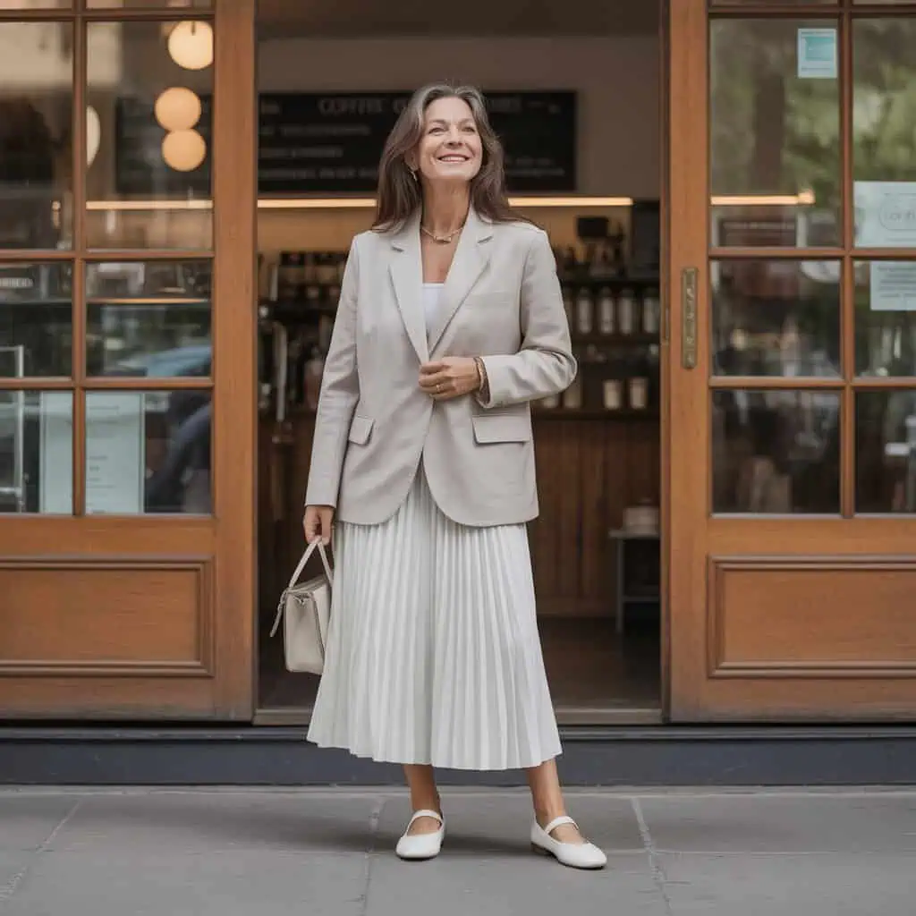 Embracing the allure of classic tailoring, a wool blazer over a tucked-in blouse instantly elevates any ensemble, creating a polished yet approachable look. The beige hue strikes a beautiful balance with the rich white ballet flats, while the pleated skirt adds a touch of timeless charm and visual interest without overwhelming the outfit. Accessorizing with a bag injects personal flair and texture, effectively transitioning the outfit from bland to standout. Small earrings bring an understated elegance that ties everything together, making it perfect for a casual outing or afternoon tea with friends.