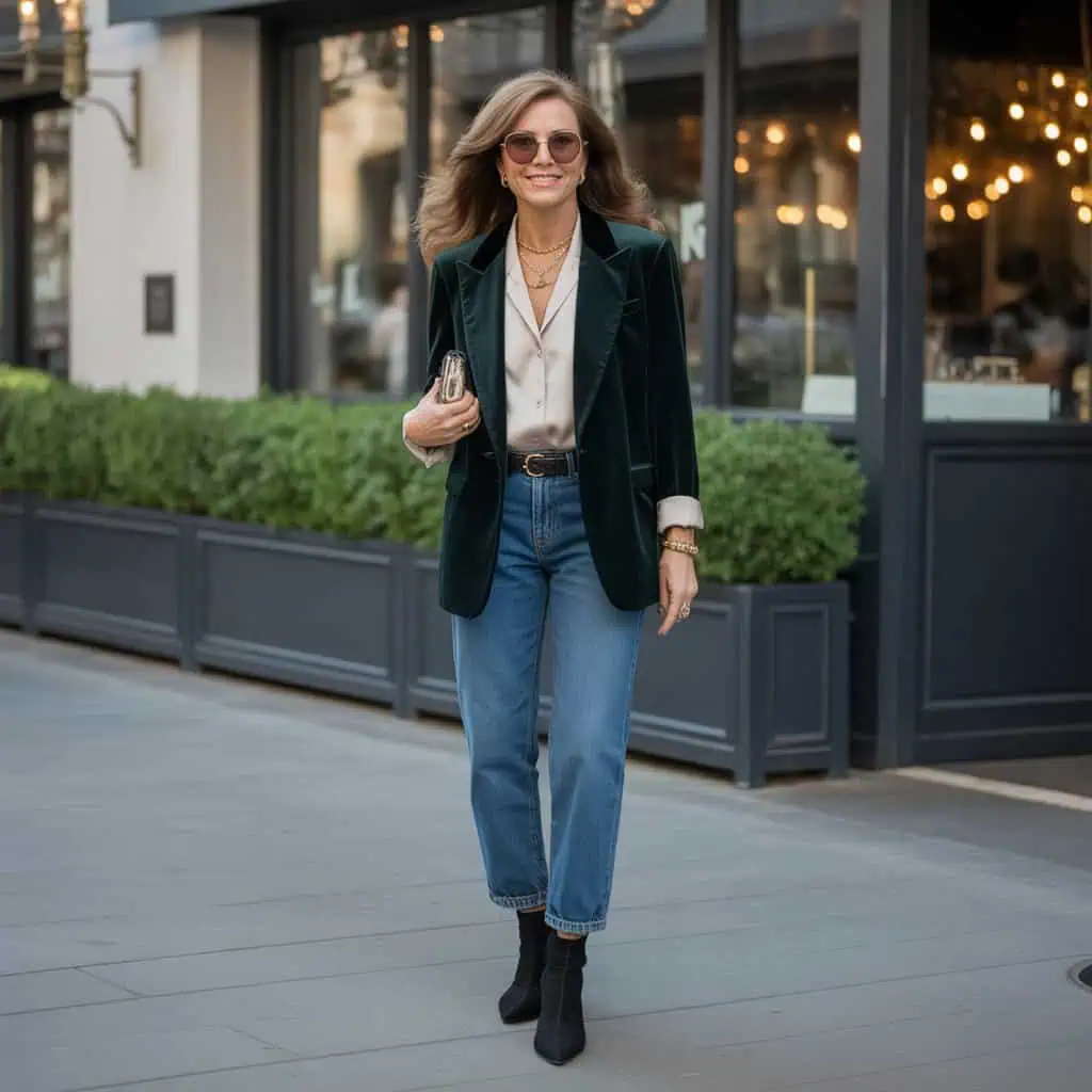 When you want to make a statement while keeping things casual, a velvet jacket is the way to go. The rich, midnight green exudes luxury, immediately elevating the outfit. Layering it over an ivory blouse introduces a crisp, fresh element that complements the opulent fabric beautifully. Straight-leg jeans offer a timeless silhouette that flatters, while the heeled ankle boots add just the right amount of elevation to the look. This outfit strikes a perfect balance between casual and chic, making it versatile for various settings. Adding layered gold necklaces and oversized sunglasses enhances the overall aesthetic, ensuring a polished presentation without losing comfort.