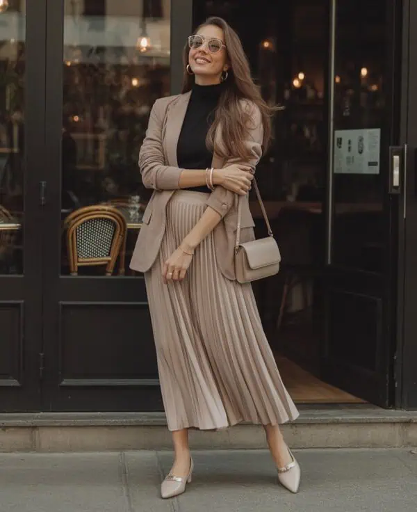 Embracing the beauty of oversized silhouettes is a chic way to prioritize comfort while looking effortlessly stylish. Layering a baggy beige sweater over a loose white shirt creates depth and interest without overwhelming the frame, and wide-leg trousers provide a modern twist that flatters the body. The waist belt not only defines the waist, enhancing the shape, but it’s also a trendy touch. Pairing this look with flat loafers keeps it grounded and comfortable, while sunglasses and minimal jewelry add a dash of sophistication—perfect for women who desire an easy, yet polished aesthetic.