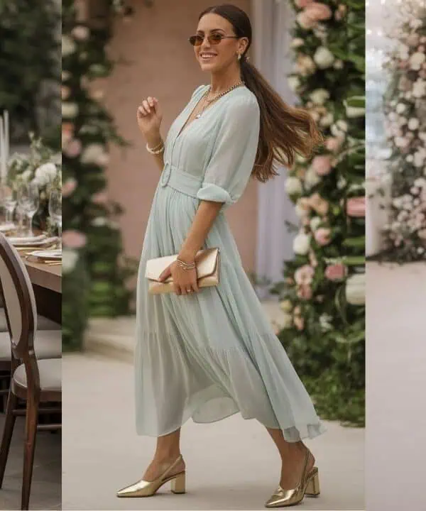 Wearing a soft-colored wrap dress embraces that perfectly; the cinched waist, the graceful drape, and an elongating V-neckline that frames the collarbone just right. It highlights curves without clinging, enhances the waistline without discomfort, and creates a natural, flowing movement that makes every step feel cinematic.