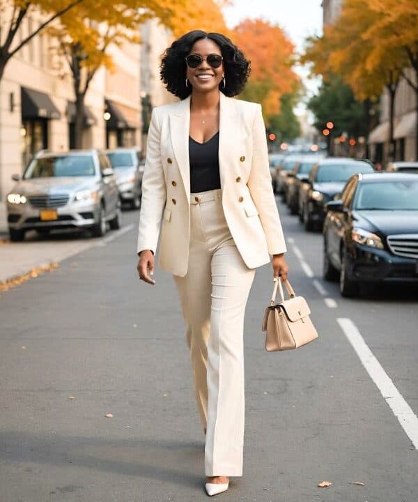 Ditching traditional plain white shirts for ones with subtle textures is a small but powerful change that can make a big difference in your overall look. Textured fabrics add a layer of depth that flatters various body types and draws the eye in a positive way. Pairing a textured button-up with tailored trousers strikes that perfect balance between polished and relaxed. Not only does the added visual interest keep the ensemble engaging, but it also enhances your personal style without resorting to loud patterns. Finish the look with sophisticated loafers and a stylish handbag to ensure you’re chic yet comfortable, effortlessly blending elegance with everyday practicality.