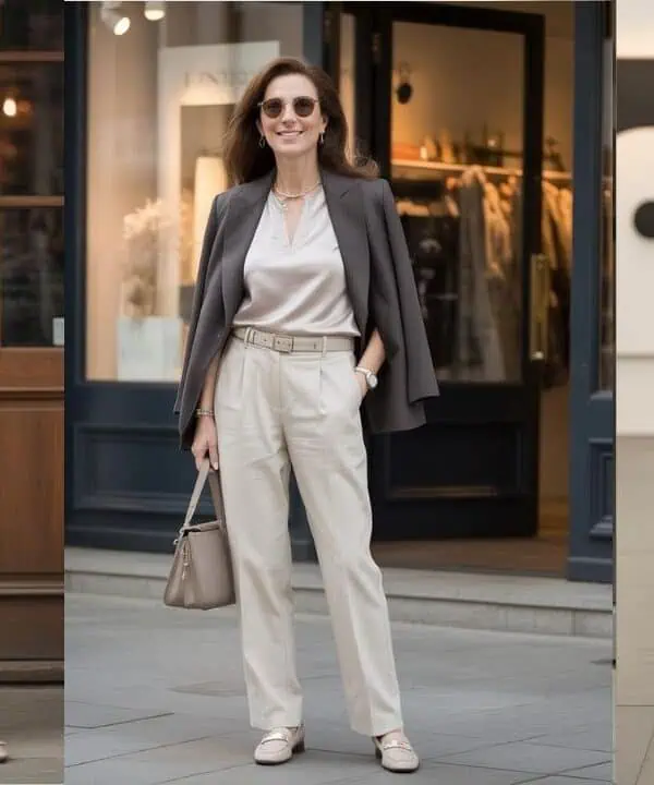 Combine the richness of navy with the earthy tones of brown for a look that radiates depth and stability. Navy is a timeless color that offers a slimming effect, while earth brown adds warmth and a grounded feel, making the combo particularly flattering for mature women.