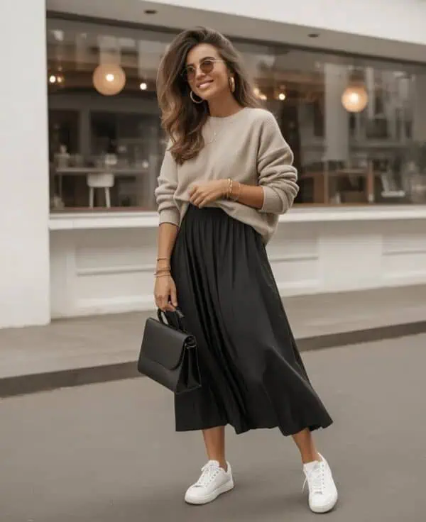 Another secret to retaining a youthful look is to invest in polished pleated skirts – such skirts, with their elegant folds and fluid drape, offer a sophisticated look that transcends age. The pleats also help elongate your legs, giving you a more statuesque appearance.