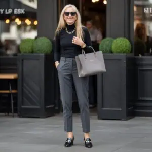 An ivory turtleneck sweater isn’t just basic; it’s a glow-up in sweater form. The soft ivory hue brings light to your complexion, making you look more vibrant and youthful, even after hours of traveling, its high neck keeps you snug, and the fitted cut highlights your waist.