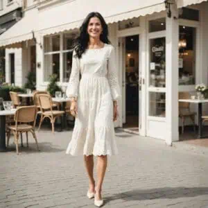 A midi dress is a versatile and age-appropriate blazer partner – the length of a midi dress provides coverage while still showcasing the legs elegantly, and the tailored lines of the blazer complement the elegant silhouette of the midi dress, adding structure to the overall look.