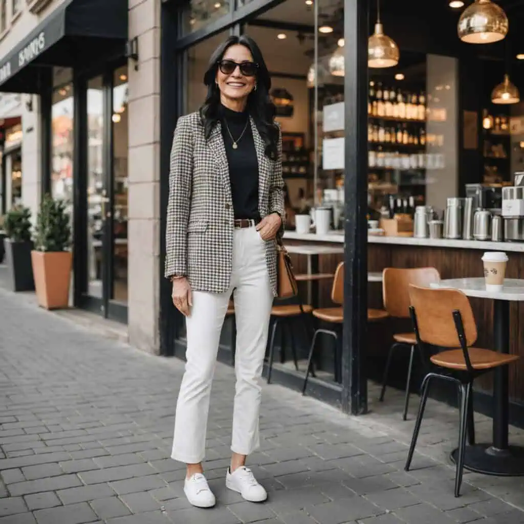 Add a dose of cool-girl charm by styling a blazer with crisp white sneakers. The contrast of tailored and casual pieces creates a dynamic outfit that feels modern and approachable.