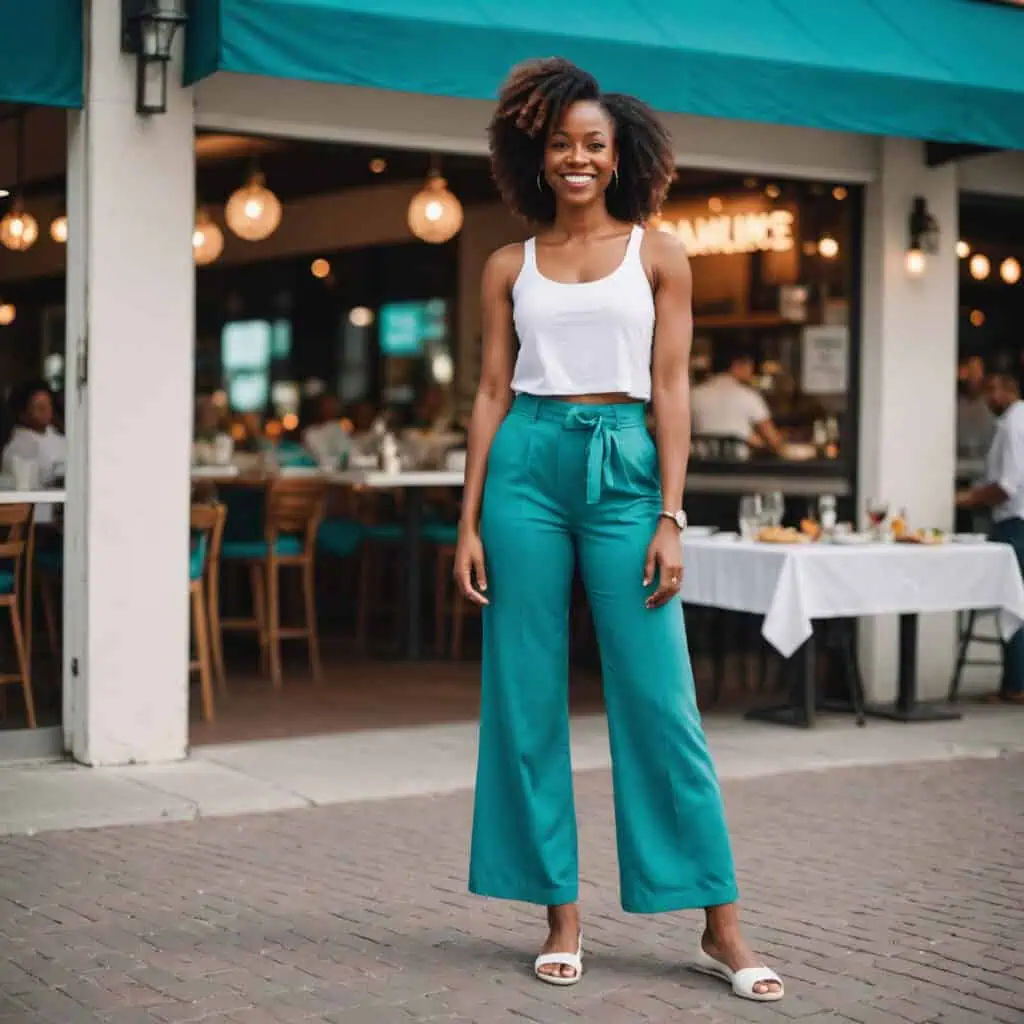 When paired with wide-leg pants, a white tank top creates an effortlessly chic look. The simplicity of a white tank offers a stark contrast to the flowing fabric of the pants, and its clean lines and classic style allow the wide-leg pants to take center stage.