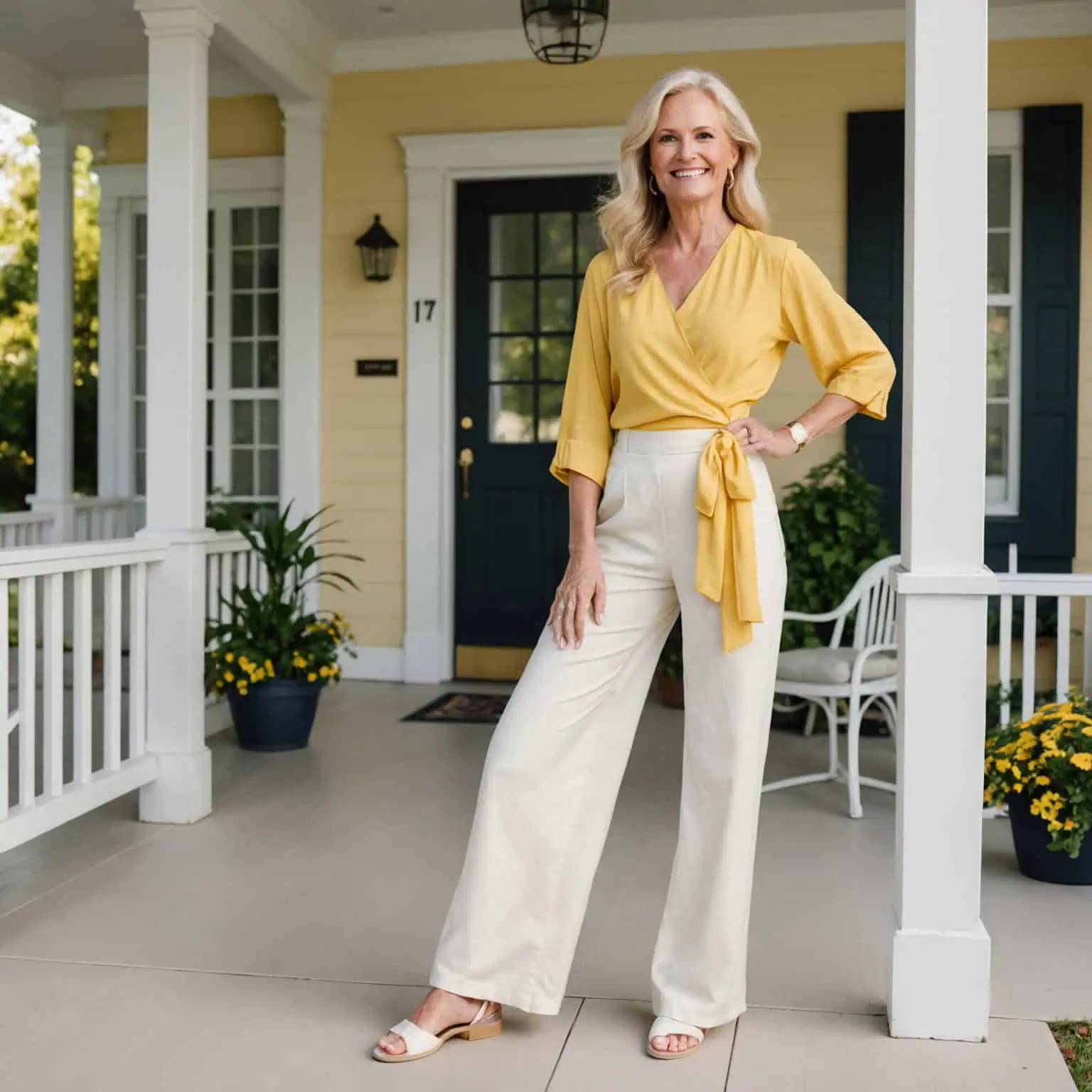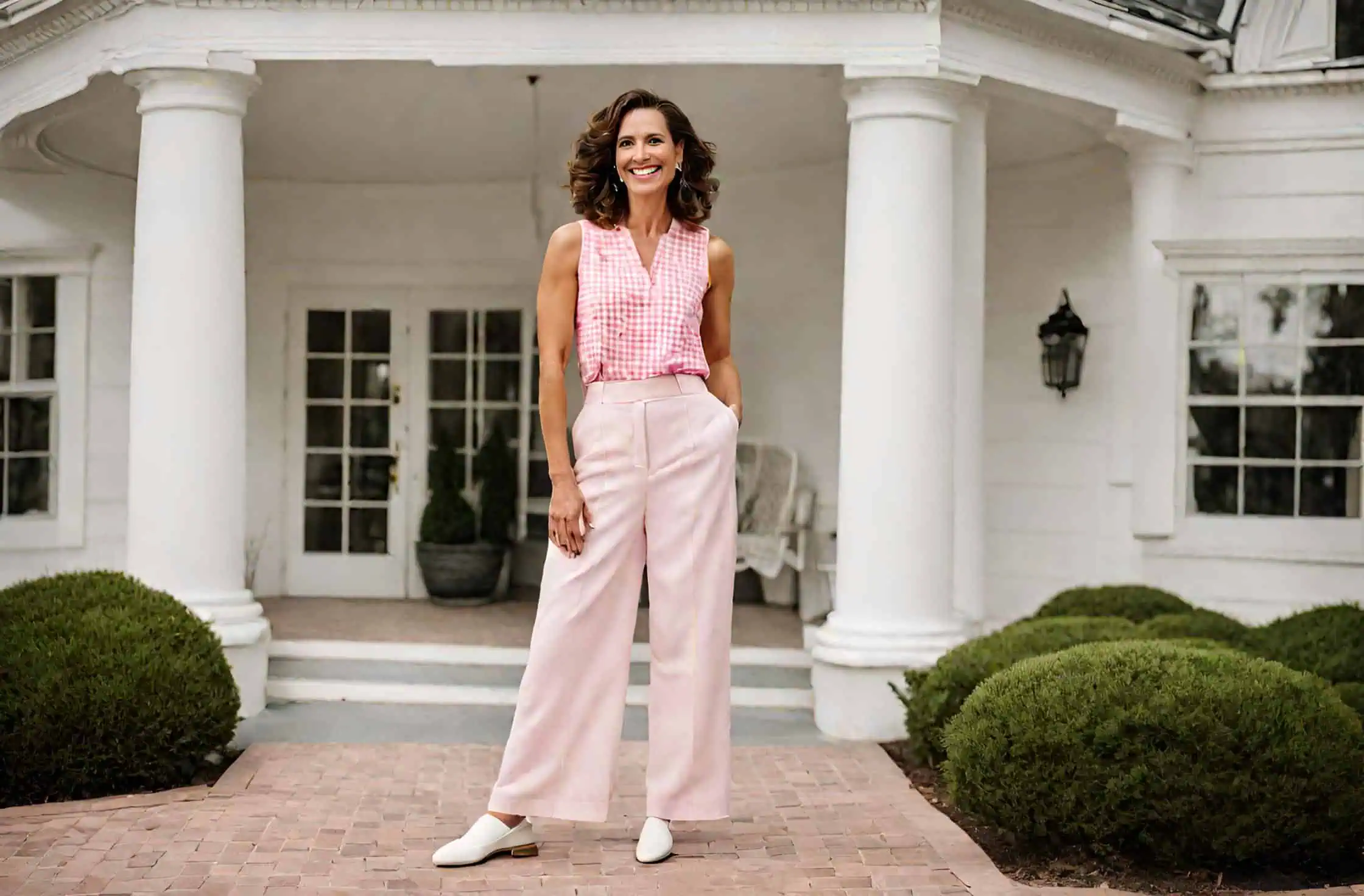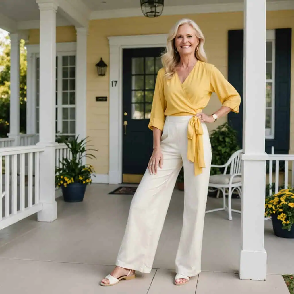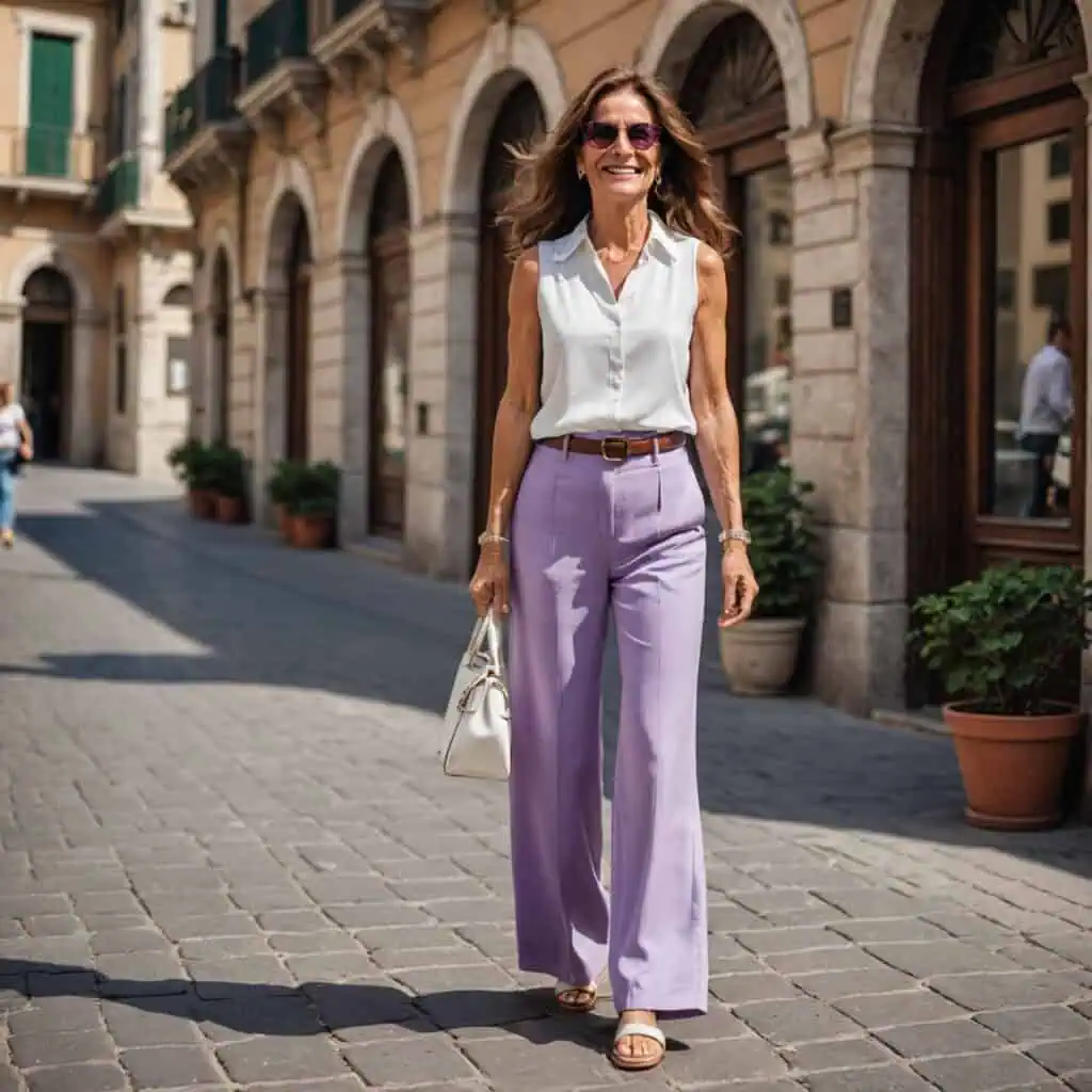 Flaunting a sleeveless button blouse brings breezy sophistication to wide-leg pants – the sleeveless design adds a touch of modernity, while the buttons provide a classic touch. The pairing creates a balanced, flattering silhouette that’s perfect for warmer days.