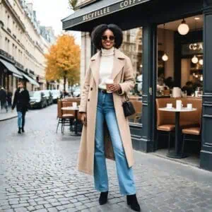 There’s something inherently luxurious about a tailored wool coat, which makes it a timeless piece for colder weather. Pairing this with wide-leg pants creates a streamlined ensemble, and the tailored fit of the coat perfectly balances out the width of the pants.