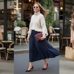Cropped culottes are quickly establishing themselves as a must-have for those looking to blend comfort with sophistication. The flared leg and tailored elegance offer a flattering fit that elongates your figure, especially when styled with a fitted top like a black turtleneck. Paired with black block heels, this combination takes on a polished appearance, perfect for transitioning from day to night effortlessly. The addition of cat-eye sunglasses and gold statement earrings injects a touch of personality and gives an elevated flair, making this outfit ideal for lunch dates or an evening out in style.