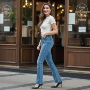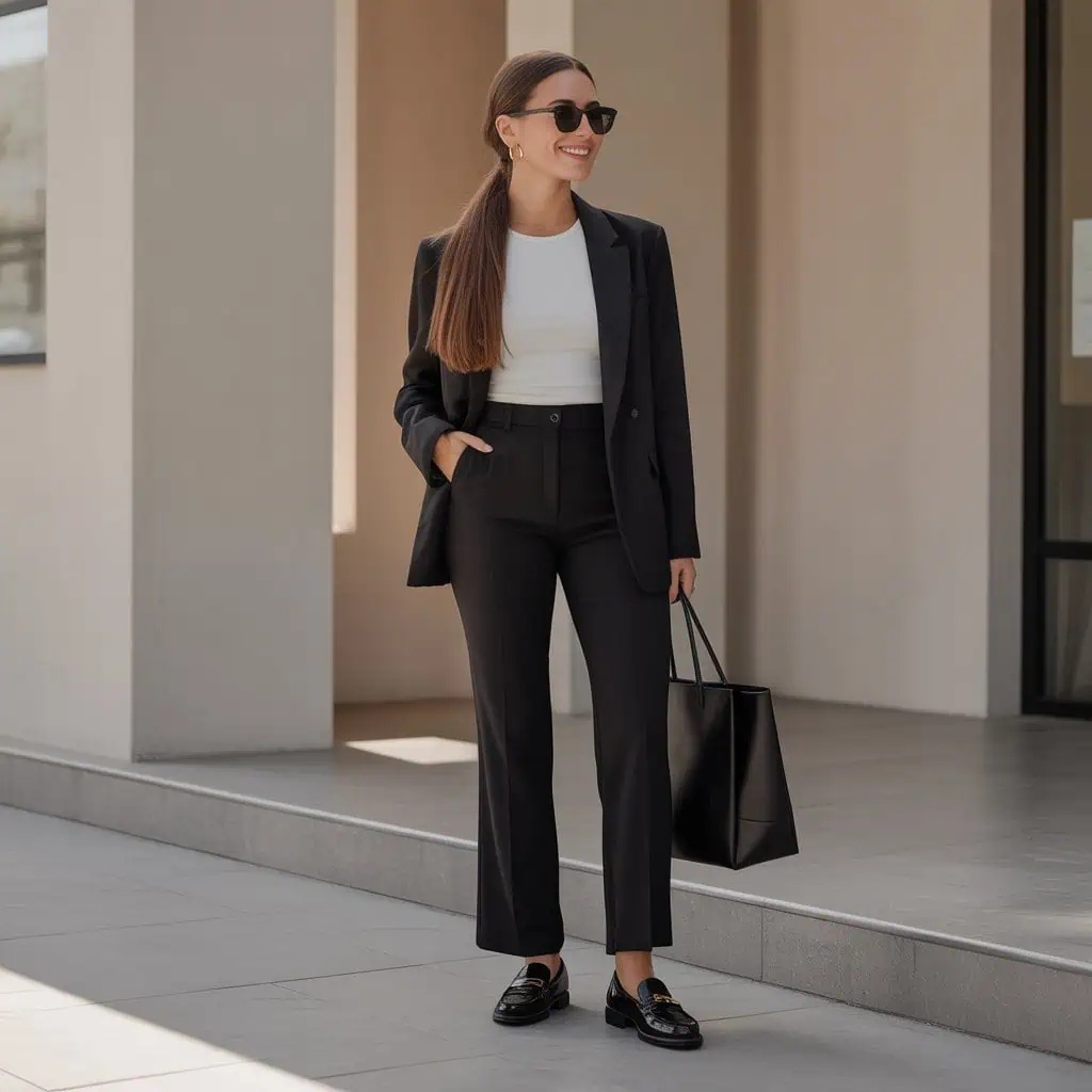 High-waisted stretch trousers paired with a tailored blazer create a streamlined look that’s both professional and stylish. This combination accentuates your waist while offering comfort and mobility, ideal for busy days where you still want to look put-together. Opting for a fitted white top under the blazer keeps the aesthetic fresh and clean, balancing the structure of the outerwear. Black loafers ground the outfit and add a touch of formality, while gold accents lend a hint of elegance. This ensemble works wonders for office meetings or dinner outings, ensuring you’ll command attention without sacrificing comfort.