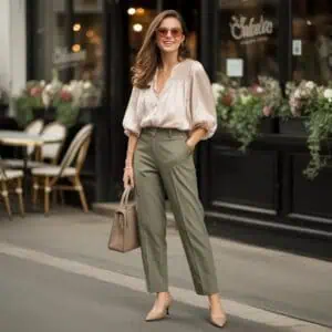 This outfit encapsulates the delicate balance between comfort and elegance, making it a staple for any chic wardrobe. A cozy ccashmere sweater exudes luxury while ensuring warmth and comfort. The trick is to tuck it into tailored trousers, which adds a dose of refinement and lends structure to the overall look. The tailored pants create a stunning silhouette, elongating the legs and defining the waist. Black suede ankle boots contribute not just style but also versatility to the outfit. Paired with an elegant structured leather handbag, oversized sunglasses, and delicate gold jewelry, this combination is perfect for those who wish to radiate sophistication without sacrificing comfort. It’s the kind of outfit that speaks to personal style while effortlessly showcasing a refined aesthetic.