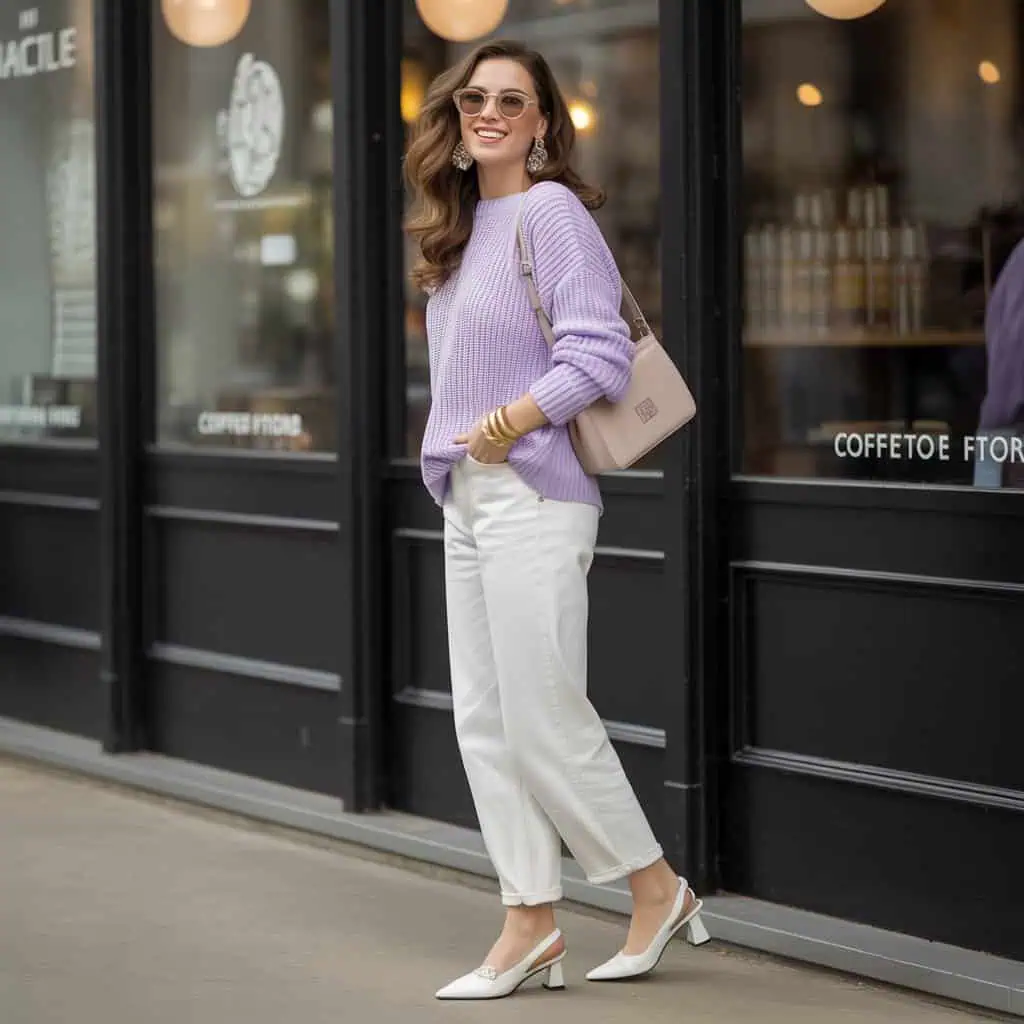 A midi skirt paired with a soft sweater creates a beautifully balanced silhouette that’s both romantic and effortlessly chic. The flowing nature of the skirt adds movement and grace, making it perfect for day-to-night occasions. Tucking the cozy oatmeal-beige sweater into the waistband not only defines the waist but also creates a polished look while maintaining supreme comfort. Sleek white sneakers keep the outfit grounded and approachable, marrying comfort with style flawlessly. By adding chunky gold hoop earrings and delicate bracelets, the outfit gains a touch of playful elegance, demonstrating how smart accessorizing can elevate even the simplest of outfits into something truly stunning.