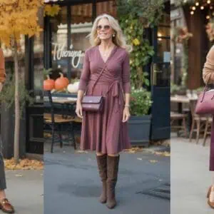Maxi coats are the ultimate statement piece for fall, effortlessly bringing sophistication while providing ample warmth. A tailored camel maxi coat elevates any outfit, particularly when layered over a cream turtleneck, which softens the look and offers a chic contrast. The straight-leg beige trousers contribute to a streamlined silhouette, allowing the coat to become the focal point of your ensemble. Pairing this look with black slingback kitten heels keeps it comfortable yet stylish, ideal for daily errands or outings. Accessorize with minimal gold hoop earrings and a structured black handbag, and you have a timeless look that radiates confidence and elegance at any age.