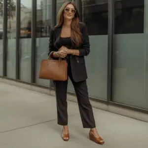 Pairing a soft blazer with a knit tee and tailored trousers is a masterclass in blending comfort with sophistication. The gentle structure of the blazer elevates the casualness of the knit tee, creating a polished, yet approachable look. This outfit leverages the versatility of tailored trousers that flatter and lengthen the legs, making it ideal for various occasions, from brunch with friends to casual workplace meetings. The soft tones of the palette harmonize beautifully, while the block-heel pumps add just the right amount of elevation without sacrificing comfort. Complete the look with statement accessories like oversized sunglasses and delicate jewelry to exude effortless elegance.