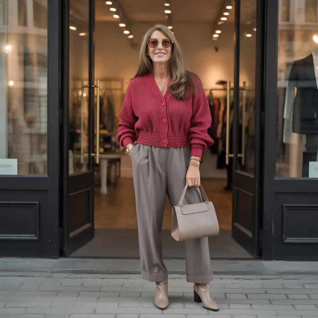 The waist-defined cardigan is a fantastic layering piece that enhances the natural silhouette while providing warmth during chilly days. This cherry red shade not only adds a touch of sophistication but also exudes an earthiness that complements a variety of skin tones. By opting for a silhouette that’s cinched at the waist, you’re able to balance comfort with a tailored look. Pairing it with tailored trousers and chic ankle boots creates an effortlessly stylish outfit that transitions seamlessly from casual outings to more polished affairs. Let the structured black handbag and gold accessories elevate the look, giving it that perfect blend of chic and cozy.