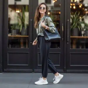 A ribbed mock-neck sweater is truly a winter essential that combines elegance and comfort. Its snug fit hugs the body in all the right places, creating a flattering outline that looks fantastic on a mature figure. The deep green hue provides a refreshing pop of color against the typical winter palette, making you stand out while remaining refined. When tucked neatly into tailored black trousers, the ensemble achieves a sleek, streamlined effect. The addition of cognac suede ankle boots with a stacked heel gives just the right touch of sophistication, while gold jewelry plays beautifully against the sweater’s texture, elevating the overall aesthetic effortlessly.
