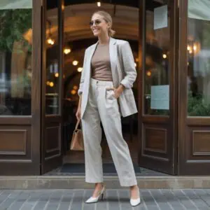 Pastel knit tops are not just cozy; they also exude an inviting aura perfect for spring. The soft hues blend seamlessly with the season’s blooming spirit, while the texture adds warmth and dimension to your style. Half-tucking the fluffy sweater into high-waisted beige trousers creates a balanced ensemble that highlights your waist, enhancing your figure. Nude slingback heels lend a refined finish, elongating the legs without sacrificing comfort. Layered gold necklaces introduce a touch of elegance, making this outfit versatile for everything from brunch with friends to afternoon art gallery visits while maintaining a laid-back yet chic vibe.