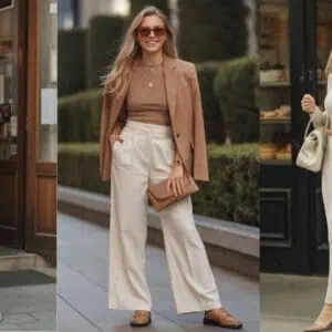 Combining camel and cream creates an effortless yet chic look that’s perfect for winter’s softer color palette. The warmth of the camel oversized knit sweater effortlessly contrasts with the fresh brightness of cream wide-leg trousers. This pairing not only beckons a cozy vibe but also lengthens the silhouette, creating a sophisticated feel. Accent gold jewelry captures the light, adding a touch of elegance without overwhelming the natural tones. The cream block-heeled ankle boots offer comfort and style, making this outfit ideal whether you’re sipping coffee or mingling in a festive glow.