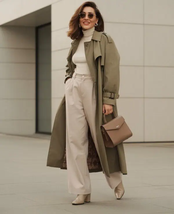 Olive green brings an earthy richness to any outfit, complementing the understated elegance of beige, making it a go-to combination for the colder months. Layering an olive oversized jacket over a beige knit sweater offers depth and texture, enveloping you in warmth without sacrificing style. The tailored beige trousers add a refined finish, lending a structured look that balances the relaxed vibe of the outer layer. When paired with trusty tan loafers and gold stud earrings, this ensemble becomes effortlessly chic, perfect for both casual outings and more refined winter events.