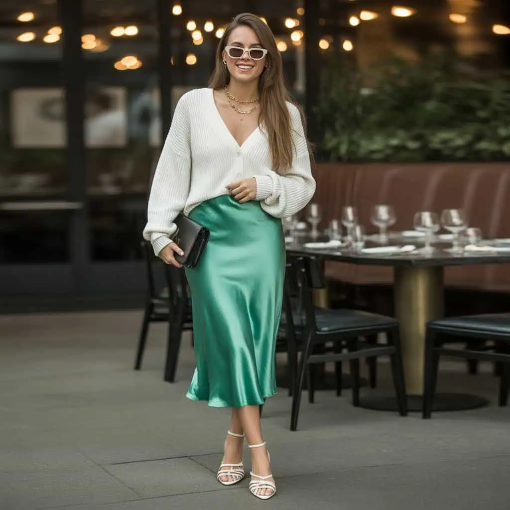 Pairing a chunky knit cardigan with a satin skirt strikes an exquisite balance between texture and silhouette. The softness of the knit contrasts beautifully with the sleekness of a pleated midi skirt, making for a striking yet comfortable combo. A pop of white from the sweater brightens up the winter palette, while the satin skirt grounds the look, providing a rich visual element. Strappy heels maintain sophistication, and opting for accessories keeps it cohesive. This outfit exudes a cozy yet glamorous aura, ideal for those who want to stand out while staying warm and stylish.