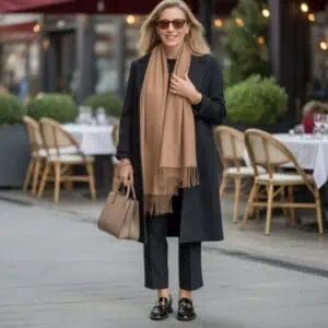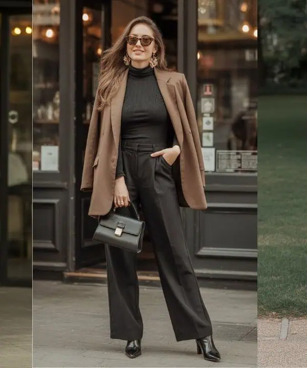 Layering is key in winter, and the combination of a belted cardigan over a fitted turtleneck highlights both style and structure. Opt for muted tones like cream and beige to create a soft, monochromatic look that’s visually appealing. The tailored trousers keep everything polished, balancing the coziness of the cardigan. Finishing touches such as gold hoop earrings add a hint of elegance without overpowering the ensemble, while loafers provide comfort and sophistication. This outfit captures that effortless chic vibe perfect for winter outings, making it both functional and fashionable.